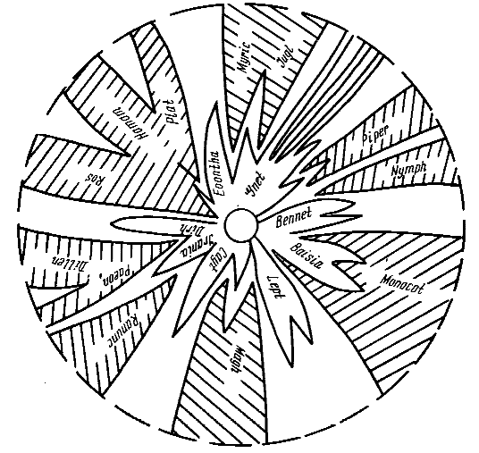 Эта общая схема вытекает из анализа большого числа местонахождений, количественных взаимоотношений между антофитами и другими растениями (папоротниками, беннетитами, гнетовыми), а также между различными группами антофитов. Автор склонен рассматривать ее как основу для дальнейших исследований.