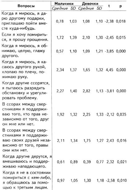 Гипотезу о наличии сформированных представлений о правилах поведения после конфликта у подростков 14-15 лет, мы проверили с помощью опросника, предложив заполнить его московским школьникам. Как показали результаты опросов, у подростков в возрасте 14-15 лет уже имеются отработанные стереотипы поведения в пост-конфликтной ситуации (Таблица 7) (Бутовская, Буркова, Митавская, Тименчик, неопубликованные данные). Отчетливо проявляются тендерные различия. Девочки демонстрируют большую социальную компетентность, более высокий уровень эмоционального переживания в связи с недавним конфликтом и чувство вины за содеянное чаще, чем мальчики. Девочки также чаще готовы просить прощения у недавнего противника.