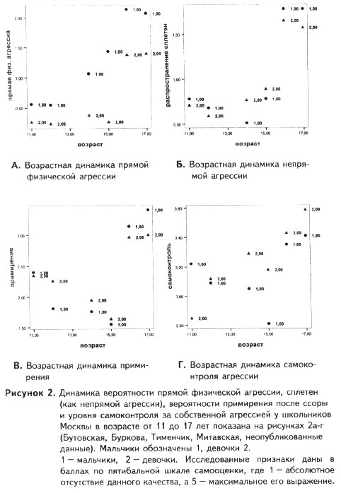 Опросы подростков, учащихся московских школ, показали в целом следующее: вопреки мнению некоторых специалистов (Берн, 2001), можно выделить целый ряд тендерных различий в социальном поведении. Прежде всего, это касается уровня физической агрессии. Уже в возрасте примерно 2 лет этот показатель достоверно выше у мальчиков, и он продолжает устойчиво сохраняться на более высоком уровне у мальчиков во всех проанализированных нами возрастах, начиная от 6-7 лет (этологические наблюдения) и кончая 17 годами (результаты опросов). По нашим данным, девочки достоверно перегоняли мальчиков по уровню сплетен лишь в возрасте 14-15 лет. Во всех остальных исследованных возрастах (от 11 до 17лет) различия были недостоверны, причем мальчики в 11-12 лет и 16-17 лет сплетничали чуть больше девочек. К.Бьерквист с соавторами (Bjorkqvist et al., 1992) исследовали прямую и непрямую агрессию у финских подростков из г.Тирку и получили несколько иные результаты по уровню сплетен (данные собраны по трем возрастным категориям: 8, 11 и 15 лет): во всех возрастах девочки сплетничали больше мальчиков и максимум различий приходился на 11 лет. Интерес представляет динамика самоконтроля у мальчиков и девочек. Минимум самоконтроля у девочек приходится на 11 лет. В этом возраст уровень самоконтроля у мальчиков значительно выше. К 12 годам эти показатели у обоих полов практически идентичны. Начиная с 13 и далее устойчиво до 17 лет, девочки достоверно перегоняют мальчиков по самоконтролю за собственным агрессивным поведением.