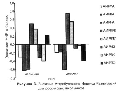 Разные культуры по-разному относятся к внутригрупповой агрессии и no-разному реагируют на действия участников конфликта в пост-конфликтный период. Разумеется, здесь не идет речь о том, что в каких-либо культурах приветствуется избегание контактов с бывшим противником или демонстративное нежелание урегулировать конфликт. Однако, в некоторых культурах использование физической агрессии для разрешения споров допустимо, тогда как в других однозначно осуждается. В силу особенностей культурных установок применительно к конфликтной ситуации, индивидуальная (оценка своих собственных действий) и групповая (оценка действий данного индивида со стороны группы, в которой он пребывает) оценки могут сильно различаться. Различия между этими оценками, выраженными в баллах, являются достаточно четким показателем социальной желательности конкретного поведения и могут быть представлены в виде Атрибутивного Индекса Разногласий (АИР). Для российских школьников г.Москвы в возрасте от 11 до 15 лет (п=212, из них 101 мальчик и 111 девочек) вычислили такой атрибутивный индекс для следующего набора показателей: физическая, вербальная и непрямая агрессия, конструктивное разрешение конфликта, вмешательство третьего лица, избегание, виктимизация, популярность (Рисунок 3) (Butovskaya, Timentschik, Burkova, 2004; неопубликованные данные).