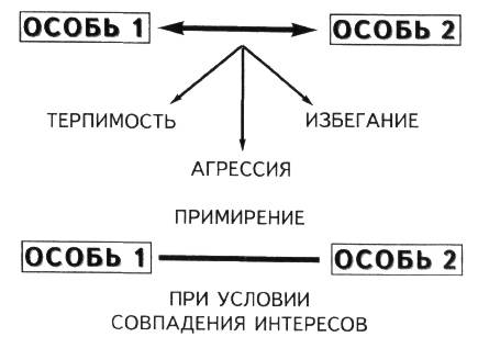 Рисунок 1. Агрессивное поведение и примирение как взаимосвязанные составляющие единого процесса взаимодействия в пределах пары индивидов в рамках Модели Отношений (дана по de Waal, 2000, р.27). В соответствии с Моделью Отношений, агрессивное поведение представляет собой лишь один из способов урегулирования конфликтов между особями. Другие возможные способы: толерантность (дележ ресурсами) или избегание конфронтации. В случае, если агрессия все же имеет место, возможность восстановления отношений зависит от качества этих взаимоотношений: при условии выраженной взаимной заинтересованности во взаимоотношениях, примирение возможно. Стороны постоянно "ведут переговоры" относительно взаимоотношений друг с другом: конфликты чередуются с примирением.