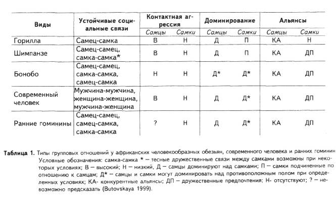 В таблице 1 показаны взаимосвязь социальных и экологических факторов в эволюции гоминин. Предположительно, роль механизмов примирения возросла на этом этапе эволюции. Формирование тесных устойчивых связей между самками, усиление кооперации между самцами и формирование долговременных пар самец-самка обеспечило благоприятный климат для развития механизмов контроля социальной напряженности на уровне всех групп. Высокий уровень примирения весьма вероятен на этом этапе развития гомининных сообществ, поскольку есть все основания предполагать, что отношения в группах ранних гоминин носили эгалитарный характер (Butovskaya, 1999).