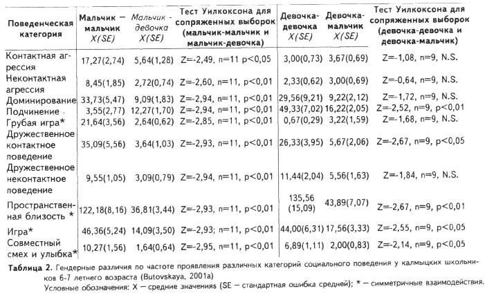 Результаты показывают, что мальчики склонны применять контактную агрессию почти втрое чаще, чем девочки (Butovskaya, Kozintsev, 1999a,b; Butovskaya, 2001a). Частота произведенной контактной агрессии в группе калмыцких детей, приходящаяся на одного мальчика, была примерно в три раза выше, чем на одну девочку. Мальчики достоверно чаще направляли контактную агрессию на детей своего пола (Таблица 2). Половые различия по частоте неконтактной агрессии были недостоверны. Однако, и в этом случае, получены достоверные отличия по количеству направленной неконтактной агрессии со стороны мальчиков в направлении представителей своего и противоположного пола (Таблица 2). Грубая игра практически полностью являлась прерогативой общения мальчиков. Мальчики и девочки были склонны достоверно чаще проявлять доминирование по направлению к детям своего пола, а подчинение — к детям противоположного пола. То же было верно и в отношении дружелюбного поведения.