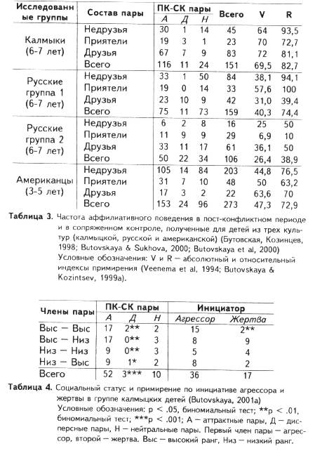 Выявлена была также достоверная положительная связь между агрессивным и дружественным поведением. Такое, на первый взгляд, парадоксальное явление имеет под собой реальный смысл, если мы вспомним о Модели Отношений, упомянутой выше. Друзья чаще других находятся рядом друг с другом, хорошо осведомлены о характере партнера и на основе предшествующего опыта уже знают, что помириться с другом проще, чем с нейтральным ребенком из собствен ной группы. Вероятность примирения показана для русских, калмыцких и американских детей (соотношение пар разных типов дано в зависимости от уровня дружественных отношений) (Таблица 3) (Butovskaya et al., 2000).