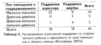 Анализ частоты вмешательства третьего ребенка на стороне агрессора и жертвы представлен для калмыцких школьников (Табл.5). Похоже, что мальчики в целом больше склонны помогать агрессору, чем девочки.