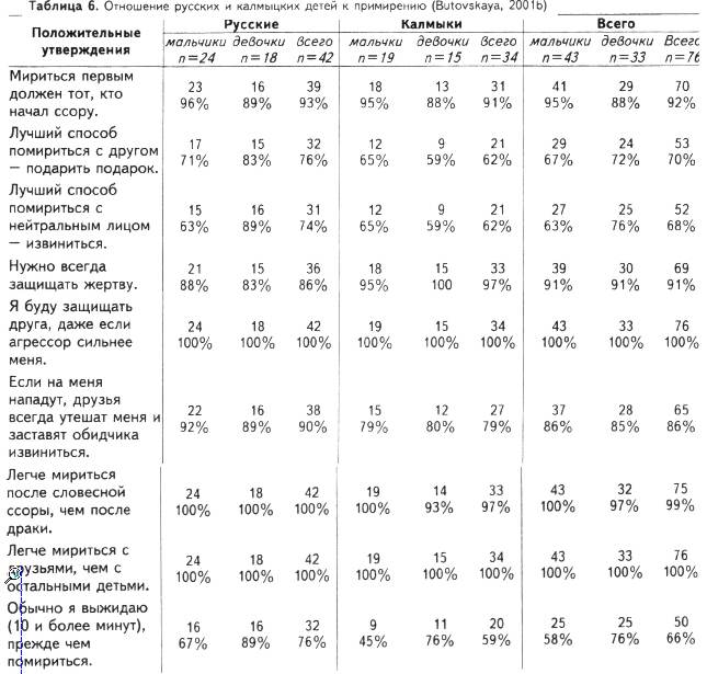 Индивидуальные интервью, с русскими и калмыцкими детьми позволили выявить их установки относительно правил поведения после конфликта (Таблица 6). Было показано, что дети к 7 годам имеют уже достаточно четкие представления о том, как следует себя вести после конфликта с другими, в зависимости от степени близости отношений с конкретным партнером. Их представления четко следуют нормам поведения, принятым в данной культуре. Это касается вопросов о том, кто должен мириться первым (агрессор). Ответ соответствует результатам этологических наблюдений. Дети отмечают, что с друзьями мириться легче. Если вспомним, выше мы говорили о том, что в рамках представлений о "дозволенности" агрессивных взаимодействий с конкретным партнером ожидается, что конфликты будут происходить чаще с теми, с кем легче мириться в дальнейшем. И именно с друзьями дети чаще конфликтовали по это-логическим наблюдениям. Дети также говорили, что при примирении с друзьями следует применять более интимные и выразительные способы интеграции (подарки, поцелуи), тогда как при примирении с нейтральными лицами формальных извинений бывает достаточно. Определенные правила поведения третьих лиц так же присутствуют в поведении 6-7 летних школьников: нужно защищать жертву, защищать друга против более сильных детей. Дети также верят, что друзья всегда заступятся за них и придут на помощь (реципрокный альтруизм в действии). Действительно, если вспомнить этологичес-кие данные, друзья часто приходят на помощь. Однако, мальчики помогают нападающему, а девочки, чаще помогают жертве.