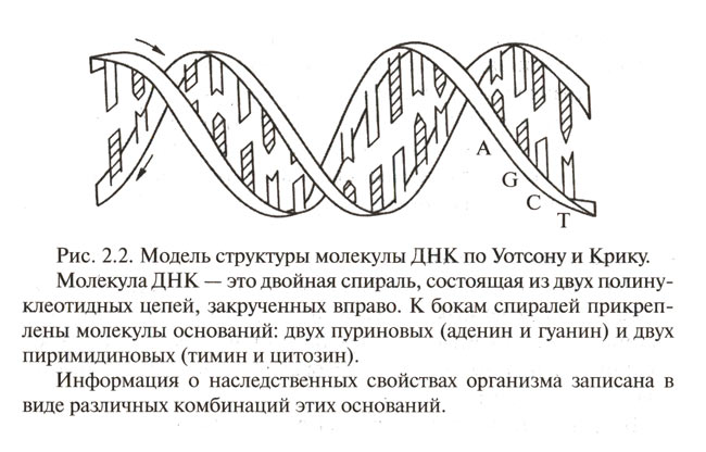 В 1953 году Дж. Уотсон и Ф. Крик, впоследствии нобелевские лауреаты, предложили модель строения молекулы ДНК в форме двойной спирали (рис. 2.2).
