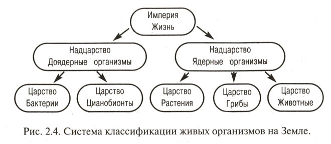 На рис. 2.4 приведена система классификации живых организмов на Земле, включающая Империю (Жизнь), два надцарства (доядерные организмы прокариоты и ядерные организмы — эукариоты) и пять царств (царства бактерий, цианобионт, растений, грибов и животных). Надцарство прокариот (доядернных организмов) появилось на Земле 3,8—3,1 млрд. лет тому назад. Это одноклеточные и многоклеточные (колониальные формы) организмы, не имеющие обособленного ядра.