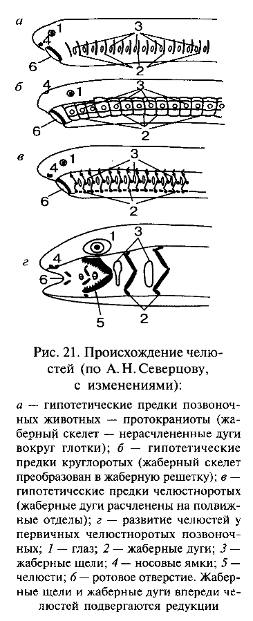 энергично сжимая жаберную область. Этот путь эволюции оказался преадаптивным для возникновения челюстей. Передние висцеральные дуги при наличии сильных мышц, сжимающих «гармошку», получили возможность способствовать удерживанию добычи. Подчеркнем, что эта новая адаптивная роль была приобретена на основе преадаптации, связанной с усовершенствованием прежней (дыхательной) роли висцеральных дуг. Новая адаптивная роль (захват и удерживание добычи) оказалась столь важной, что прежняя роль (участие в дыхательных движениях) у передней жаберной дуги (челюстной) отступила на второй план, а затем была утрачена (рудиментарная жабра челюстной дуги сохраняется у всех рыб в виде так называемой ложножабры, теряющей непосредственную связь с челюстной дутой и находящейся у костных рыб на внутренней поверхности жаберной крышки).