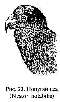 Однако известен один вид попугаев, который действительно использовал указанные признаки при освоении хищного образа жизни. Попугай кеа (Nestor notabilis) (см. рис. 22), обитающий в горных районах южного острова Новой Зеландии, питается обычно различной растительной пищей (фрукты, нектар цветов), а также мелкими беспозвоночными животными (черви, насекомые), которых добывает из-под камней. Однако начиная с 1868 г. были отмечены случаи нападения кеа на овец, пригоняемых на горные пастбища. Хищнические наклонности проявляют отдельные особи попугаев: они расклевывают на спине овец огромные раны (до 10 см), от которых жертва быстро погибает. Мясо погибших овец поедают не только птицы-убийцы, но и другие кеа. Поскольку овцеводство появилось в Новой Зеландии после прихода туда европейцев (до этого на острове не было других млекопитающих, кроме крыс и летучих мышей), очевидно, что переход попугаев кеа к хищничеству произошел, можно сказать, на наших глазах. При этом строение клюва и когтей попугаев не претерпело никаких изменений — их использование для новой роли было пре-адаптировано прежними приспособлениями, облегчавшими попугаям лазание по деревьям и питание плодами растений. Попугаи, нападающие на овец, ничем не отличаются от других кеа. Возможно такое изменение поведения обусловлено возникновением соответствующей мутации, позволившей использовать по-новому существовавшие прежде структуры.