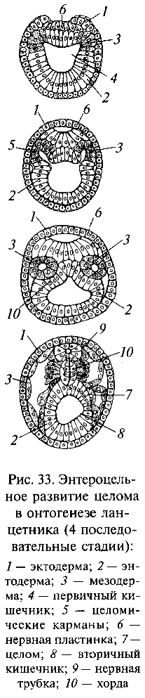 Другие филогенетические линии, ответвившиеся от проктенофор, также осваивали морское дно, но с развитием приспособлений к активному передвижению по субстрату, подобно тур-белляриям и их потомкам, но на другом исходном уровне организации. У этих форм в результате завершения эпителизации периферического фагоцитобласта также образовалась вторичная полость тела — целом, но возникла она совершенно другим способом, чем у Trochozoa. В онтогенезе животных, происходящих от проктенофор, вторичная полость тела обособляется от первичного кишечника, как его боковые карманообразные выпячивания (первоначально было, вероятно, три пары таких выпячиваний), которые затем отшнуровываются от стенок кишки (рис. 33). Такой способ развития целома получил название энтероцельного — в отличие от схизоцельного способа, характерного для Trochozoa, у которых целом возникает в результате появления полостей внутри скоплений мезодермальных клеток, без всякой связи с первичным кишечником. О. и Р. Гертвиги и И.И.Мечников обосновали гипотезу, согласно которой энтероцельный целом возник в эволюции из гастроваскулярных каналов проктенофорных предков (энтероцельная теория происхождения целома). Энтероцельный целом характерен для типов погонофор (Pogonophora), щетинкочелюстных (Chaeto-gnatha), плеченогих (Brachiopoda), мшанок (Bryozoa) и ряда других, в том числе группы так называемых вторичноротых животных (Deuterostomia), объединяющей типы хордовых (Chordata), иглокожих (Echinodermata) и полухордовых (Hemichordata). У вторичноротых животных имеется много общего, в частности особое положение дефинитивного (присущего взрослым организмам) рта, возникающего на полюсе тела, противоположном первичному эмбриональному рту — бластопору. На месте же последнего развивается анальное отверстие. Вторичноротые, несомненно, имеют общее происхождение; в качестве их предков указывают гипотетическую группу олигомерных червей, тело которых было разделено на три отдела, имелся вторичный рот и энтероцельный целом. Среди современных вторичноротых к уровню организации олигомерных червей ближе всего стоят свободноживущие полухордовые, представителем которых является желудевый червь (Balanoglossus).
