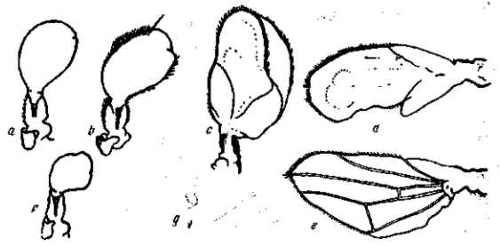 Рис. 2. Рецессивная мутация tetraptera с очень изменчивым выражением. а —нормальный гальтер (жужжальце): b — g — различные выражения мутации; b — е — стадии преобразования гальтера в крыло, f — g — редукция гальтера. По Н. В. и Н. А. Тимофеевым-Ресовским, 1933