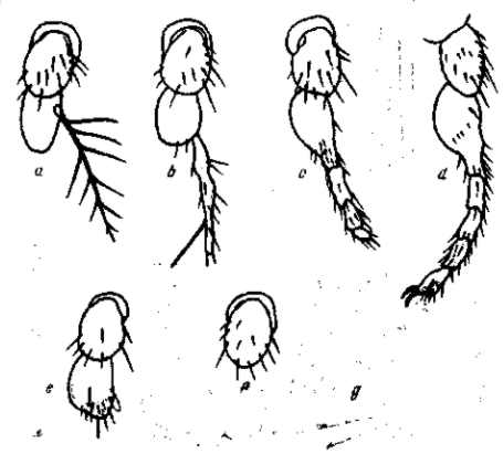 Рис. 3. Рецессивная мутация aristopedia с очень изменчивым выражением. а — нормальная антенная Drosophila melanogaster; b — g — различные выражения мутации: b — d— преобразование антенны в ножку, е — f — редукция антенны, g —полное исчезновение антенны. По Н. В. и Н. А. Тимофеевым-Ресовским, 1933