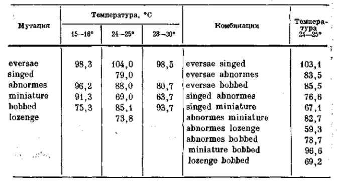 Из этой таблицы видно, что большинство мутаций связано со снижением жизнеспособности в условиях лабораторной культуры. Исключение составляет лишь мутация eversae, которая в этих условиях, при температуре 24–25°, оказывается несколько более жизнеспособной. Однако уже в условиях несколько большей плотности населения их жизнеспособность становится ниже нормы. С другой стороны, мутация bobbed обладает в уплотненных культурах более высокой жизнеспособностью, чем в нормальных. Это является некоторой иллюстрацией к сказанному ранее об условной вредности мутации. Необходимо обратить внимание и на то, что некоторые мутации при их комбинировании обнаруживают резко сниженную жизнеспособность (abnormes lozenge), а другие мутации, которые в отдельности отличаются сниженной жизнеспособностью, как miniature и bobbed, в комбинации могут восстановить почти нормальную жизнеспособность дикой формы. То же самое было показано Кюном (Kuhn, 1935) для некоторых мутаций амбарной огневки Ephestia kiihniella. О значении таких фактов мы будем еще говорить в дальнейшем. Условность вреда мутаций может быть показана и на следующем примере: веслоногий рачок Daphnia longispina обладает температурным оптимумом в 20° (по Banta, Wood, 1927) и при температуре 27° может прожить лишь несколько дней. Авторам удалось установить существование мутации этого рачка, которая гибнет в «нормальных» температурных условиях, т. е. при 20°, но имеет свой температурный оптимум между 25 и 30°.
