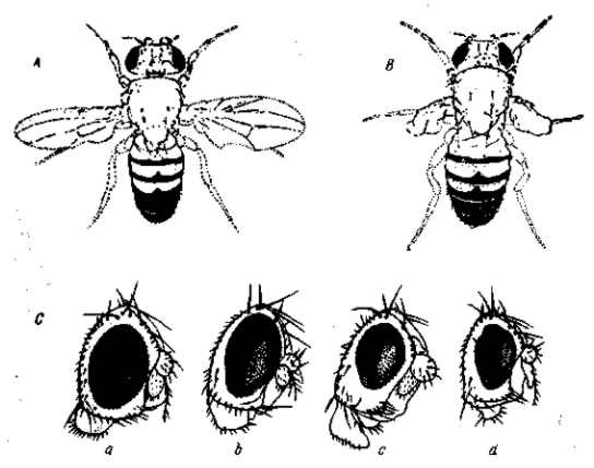 Рис. 4 Drosophila melanogaster. Рецессивная мутация short-wing с плейотропным и очень изменчивым выражением недоразвития крыльев (от нормальных до рудиментарных) и изменения их жилкования, уменьшения величины и погрубения глаз и понижения жизнеспособности. Проявление зависит от температуры: при высоких температурах мутация летальна: при 27,5° типичные ее выражения захватывают 100% всех особей; при понижении температуры процент проявления падает и при 14° все мухи неотличимы от нормальных «диких». А — самец sw с растопыренными, изогнутыми вниз крыльями, характеризующимися, кроме того, вырезками и измененным жилкованием; В — самец с уродливыми рудиментарными крыльями; С — глаза самцов с различным выражением уменьшения и погрубения глаз (a — фенотипически нормальный глаз). По Р. Экеру, 1935