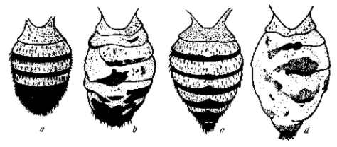 Рис. 5. Доминантная мутация уродливого брюшка Abnormal abdomen у Drosophila melanogaster. Выражение этой мутации зависит от влажности питательной среды, в которой выращиваются личинки. а, b — нормальное и мутантное брюшко самца; с, d — то же у самки. У гетерозиготы выражение мутации теряется (т. е. брюшко становится нормальным) при подсыхании корма. Доминантная мутация превращается тогда в рецессивную. По Т. Моргану, 1919