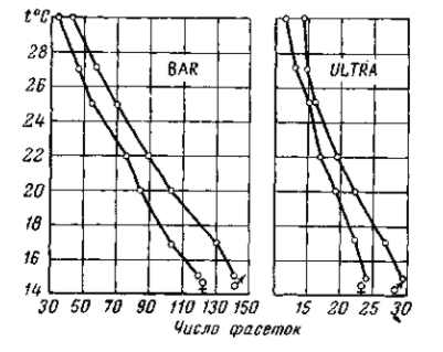 Рис.7. Обратная зависимость величины глаза и числа его фасеток от температуры У мутаций полосковидных глаз Ваг и Ultra-Bar. При повышении температуры от 15 до 30° среднее число фасеток глаза Ваг падает от 120 — 140 до 35 — 40, а среднее число фасеток глаза Ultra-Bar падает от 25 — 30 до 12–15. При этом мутация всегда сильнее выражена у самок, соответственно имеющейся паре Х-хромосом, в которых локализовано данное изменение. У самцов, обладающих лишь одной Х-хромосомой, число фасеток глаза несколько выше Слева — температурная зависимость выражения Ваг; справа — то же для Ultra-Bar. По Е. Драйверу, 1931