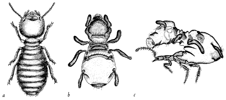 Figure 1.3 (a) A real termite, Amitermes hastatus; (b) a beetle, Coatonachthode: ovambohndicus, mimicking a termite; (c) how the trick is done. |