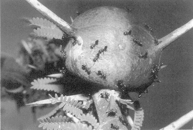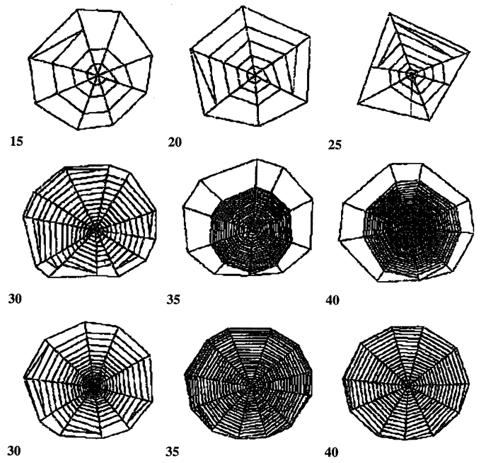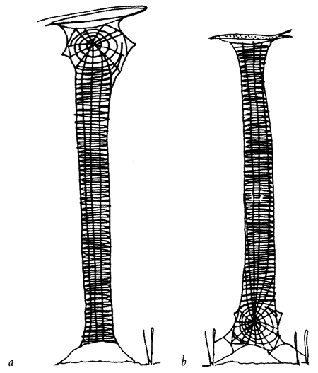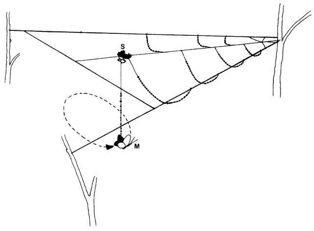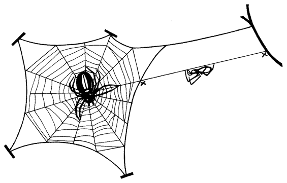 Other designoid traps are common. The Venus's fly-trap is as elegant as the pitcher plant, with the added refinement of moving parts. The insect prey releases the trap by triggering sensitive hairs on the plant, whose jaws smartly close. The spider web is the most familiar of all animal traps, and we shall do it justice in the next chapter. An underwater equivalent is the net constructed by stream-dwelling caddis fly larvae. Caddis larvae are also notable for their feats as builders of houses for themselves. Different species use stones, sticks, leaves or tiny snail shells.
