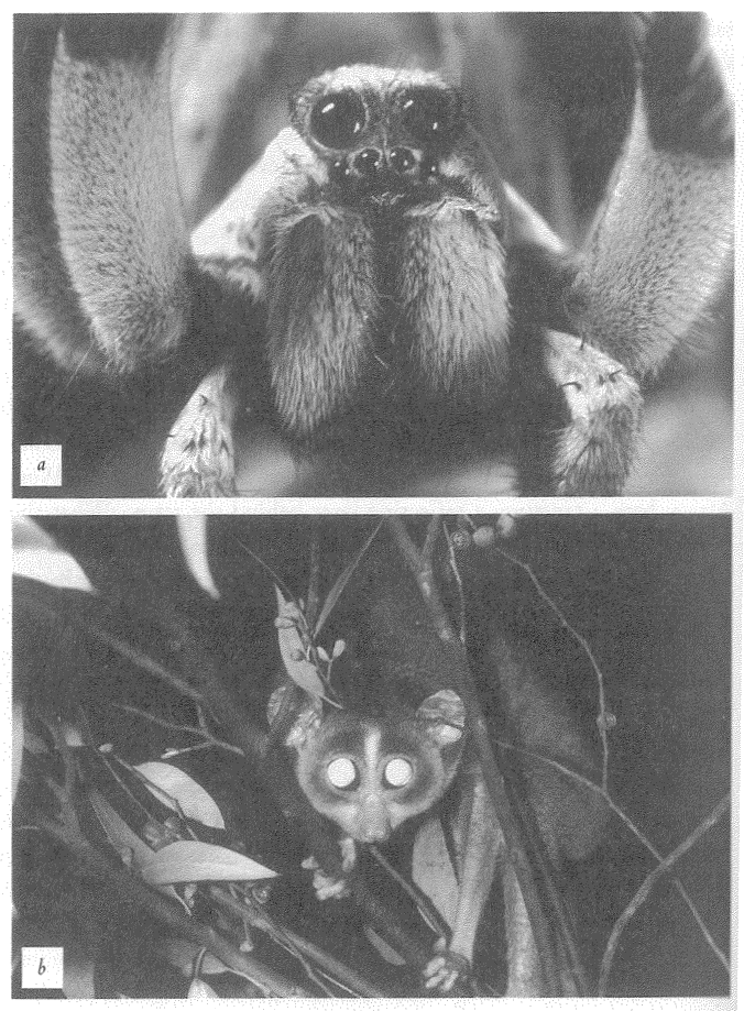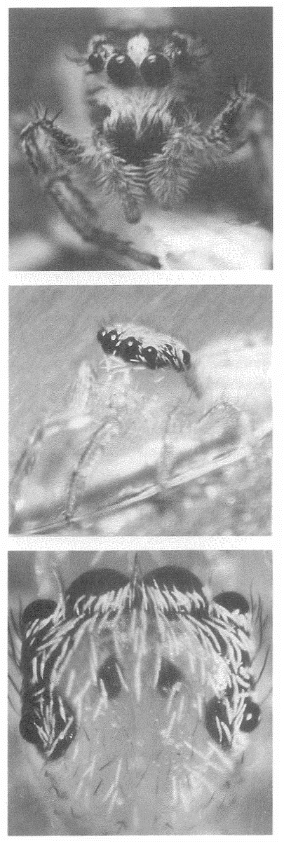 * These engaging little animals, whose habit of cocking their heads to look at you gives them an almost human charm, stalk their prey like a cat and then jump on to it explosively and without warning. Explosive it more or less literally is, by the way, for they jump by hydraulically pumping fluid into all eight legs simultaneously — a little like the way we (those of us who have them) erect our penises, but their ‘leg erections’ are sudden rather than gradual.