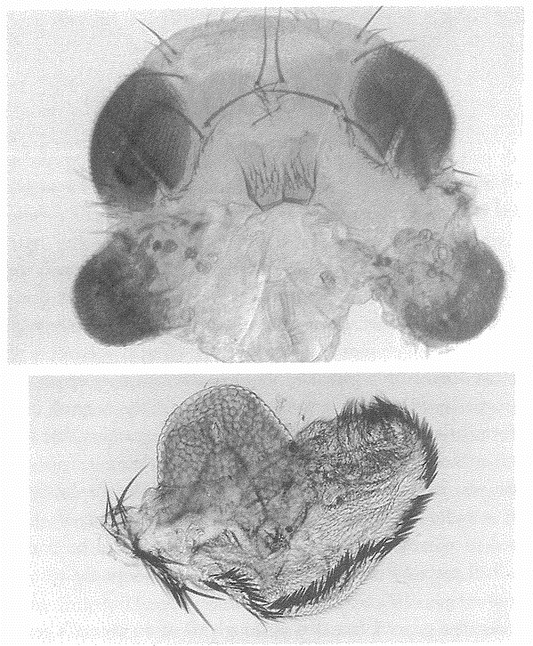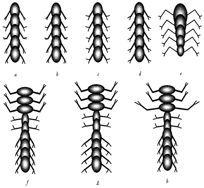 The previous example shows what a good job beetle flesh can do if it ‘sets out to mimic’ a different kind of insect. But now look at the creature in Figure 1.3b. It appears to be a termite. Figure 1.3a is a real termite, for comparison. The specimen in Figure 1.3b is an insect, but it is not a termite. It is, in fact, a beetle. I admit that I've seen better mimics in the insect world, including the ant-mimicking beetle of the previous example. The ‘beetle’ here is just a little odd. Its legs seem to lack proper joints, like little twisty balloons. Since, like any other insect, a beetle has jointed legs at its disposal, you might hope for a better shot at mimicking a termite's jointed legs. So, what is the solution to this conundrum? Why does this mimic look like an inflated dummy rather than like a real, jointed insect? The answer can be seen in Figure 1.3c, which is one of the most astonishing spectacles in all natural history. It shows the termite-mimicking beetle in side view. The true head of the beetle is a diminutive affair (you can see the eye just near the normal, jointed antennae), attached to a slender trunk or thorax bearing three normal, jointed beetle legs, on which it actually {8} walks. It is with the abdomen that the trick is done. It is arched backwards so that it hangs over and completely covers the head, thorax and legs like a parasol. The entire ‘termite’ is constructed from the (anatomically) rear half of the beetle's abdomen. The ‘termite head’ is the rear tip of the beetle's abdomen. The ‘termite legs’ and ‘antennae’ are flapping excrescences of the abdomen. No wonder the quality of the mimicry is not quite up to the standard of the beetle's ant-mimicking cousin of the previous picture. This termite-mimicking beetle, by the way, lives in termite nests, making its living as a parasite in much the same way as Figure 1.2's ant-mimicking beetle makes its living among ants. Although the quality of the resemblance is less, when you consider its starting materials the termite-mimicking beetle seems to achieve a more impressive feat of sculpture than the ant mimicking beetle. This is because the ant-mimic does it by modifying each bit of its body to look like the corresponding bit of the ant's body. But the termite-mimic does it by modifying a completely different bit of itself — the abdomen — to look like all the bits of the termite.