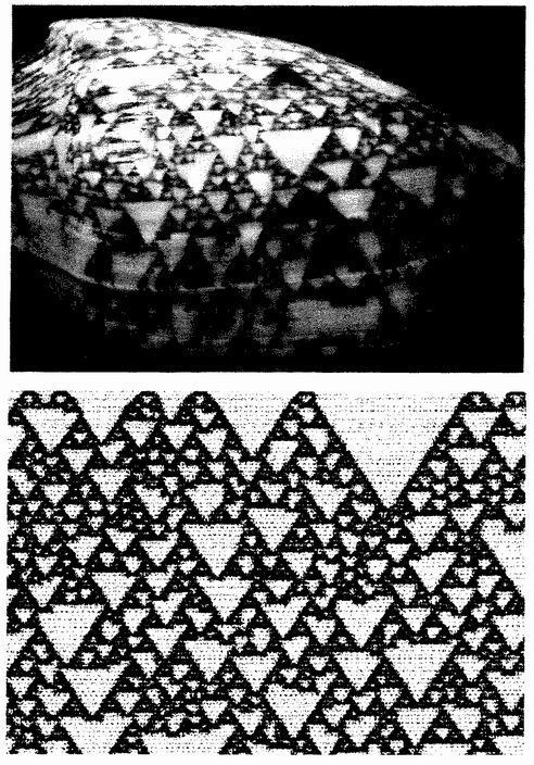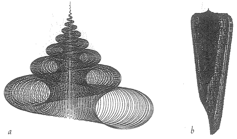 A familiar sight in various parts of the world is the conical trap of the ant-lion. This fearsome creature is the larva of — what could sound more gentle? — a lacewing fly. The ant-lion lurks just under the sand at the bottom of its pit, waiting for ants or other insects to fall in. The pit achieves its almost perfectly conical shape — which makes it hard for victims to claw their way out — not by design but as a consequence of some simple rules of physics, exploited by the way the ant-lion digs. From the bottom of the descending pit, it flicks sand right over the edge with a jerk of the head. Flicking sand from the bottom of a pit has the same effect as draining an hourglass from {14} below: the sand forms itself naturally into a perfect cone of predictable steepness.