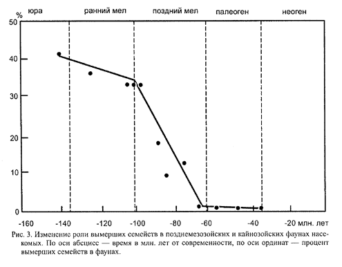 К первой половине верхнего мела (около 90 млн. лет назад) относится богатая фауна Кзыл-Жара (Южный Казахстан). В ней вымершие семейства составляют всего 18 % от общего числа семейств. Ещё моложе (около 80 млн. лет назад) фауна "янтарей" из местонахождения Янтардах (Таймыр). Вымерших семейств в ней около 10 %. Сходная картина наблюдается и в ещё более молодой фауне "янтарей" Канады (около 72 млн. лет назад). В палеогене же, как уже говорилось, вымерших семейств насекомых почти нет. Изменение доли вымерших семейств в перечисленных фаунах показано на рис. 3. Важно подчеркнуть, что датировка всех этих местонахождений произведена не по насекомым, а независимо от них по другим группам организмов, и что число семейств, изо всех этих местонахождений, позволяет считать полученные цифры достаточно надёжными. Кривая на рис. 3 показывает, что скорость вымирания семейств насекомых и обновления фауны во второй половине мела сильно возросла. Совпадение начала этого процесса с коренной перестройкой растительности не может быть случайным, так как насекомые связаны с растениями чрезвычайно тесно (опыление, питание, создаваемый растениями микроклимат). Эти перемены среди растений и беспозвоночных не могли не сказаться и на наземных позвоночных. Известно, что состав наиболее изученной группы этих животных - динозавров - сильно изменился в середине мела, хотя их полное вымирание произошло позднее. Значительные изменения произошли и в других группах рептилий - у ящериц, черепах, крокодилов; змеи впервые появились в позднем мелу. К концу нижнего мела относятся первые находки плацентарных млекопитающих (Каландадзе, Решетов, 1971) (в том числе представителей современного отряда насекомоядных). Возможно, что в мелу уже были богато представлены птицы. Вероятно, изменение состава позвоночных было вызвано переменами не только в растительности, но и в составе насекомых, от которых эволюция позвоночных во многом зависела (Родендорф, 1970). Таким образом, позднемеловая наземная биота была, по-видимому, значительно ближе к современной, чем обычно считается.