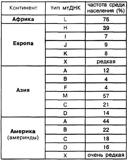 При изучении аборигенного населения Северной и Южной Америки выяснилось, что среди американских индейцев можно найти пять типов мтДНК. Четыре встречаются часто, это типы А, В, С, D (в сумме они составляют 97%); пятый, X, очень редок. Как было представлено в табл.1, четыре преобладающих типа являются азиатскими, пятый был обнаружен в Европе.