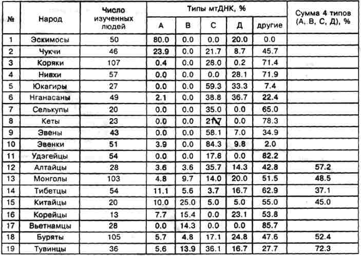 Итак, на значительной территории юга Сибири и Центральной Азии обитают народы, среди которых обнаруживаются носители всех четырех «американских» типов мтДНК. Наибольшая концентрация А, В, С, D типов приходится на тюркоязычные народы - тувинцев и сойотов. У алтайцев, также тюркоязычных, найден и не встречавшийся у других азиатских народов Х-тип мтДНК, причем оказавшийся более древним вариантом, в сравнении с X европейцев.