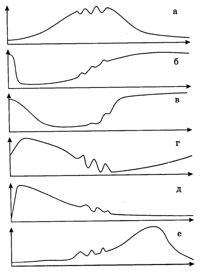 Схема филогенетического цикла (эволюции таксона). а - число видов, б - средний возраст видов, в - объем свободного пространства в адаптивной зоне таксона, г - средний объем видовой ниши (средний уровень неспециализированности видов), д - скорость появления видов, е - скорость вымирания видов |