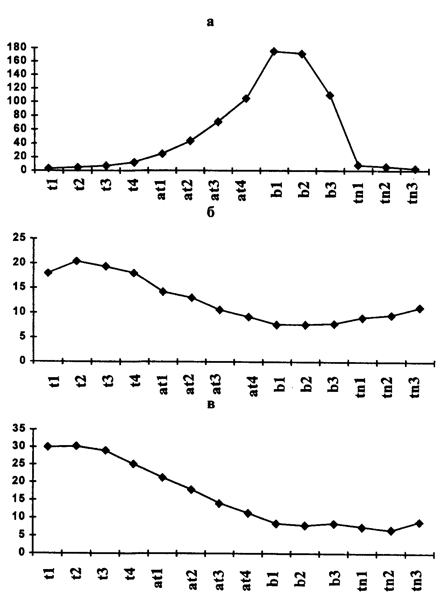 Развитие археоциат "строго по схеме". а - число родов, б и в - показатели, отражающие средний объем родовой ниши (средняя площадь ареала и средняя продолжительность существования родов); соответствуют графику "г" на схеме вверху. |