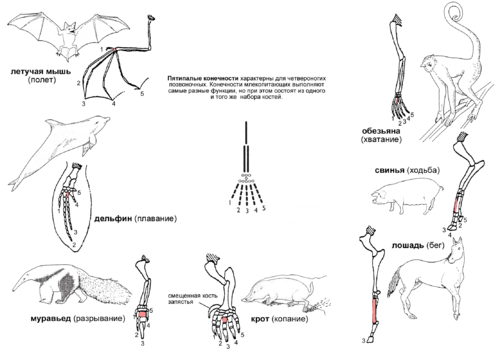 Иллюстрация принципа гомологии на примере передней конечности млекопитающих. Конечности состоят из одного и того же набора костей, но при этом выполняют самые разные функции. Третья кость пясти отмечена красным цветом.