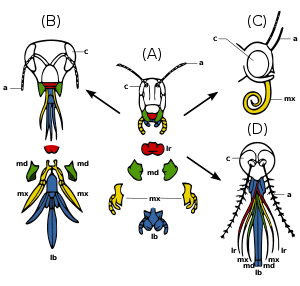 Строение головы и ротового аппарата у различных видов насекомых. a, усики; c, фасеточный глаз; lb, нижняя губа; lr, верхняя губа; md, жвалы (верхние челюсти); mx, максиллы (нижние челюсти).