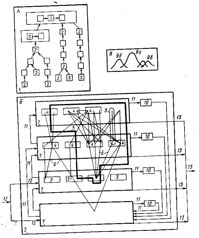 Рис. 2. Упрощенная схема структуры функциональной биоценологической модели (А - структура сукцессионной системы; сукцессионные стадии связаны вертикальными и наклонными стрелками, демутационные сообщества одной стадии - горизонтальными; Б - структура сообщества; В - структура функционального блока на примере гильдии): 1 - сукцессионная система; 2 - сообщества; 3 - синузии; 4 - гильдии; 5 -консорции; 6 - трофические сети; 7 - трофические уровни; 8 - регуляторные блоки; 9 - реализованные ниши (а - ядерные, б - сателлитные); 10 - накопление мортмассы; 11 - перенос вещества и энергии внутри системы; 12 -приток вещества и энергии извне; 13 - отток вещества и энергии
