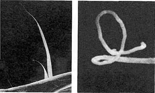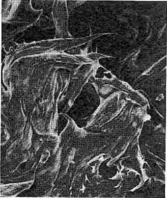 РАЗНООБРАЗИЕ ФОРМ минералов глины — один из фактов, говорящих о возможной роли глин в построении примитивных организмов. Кожистый галлойзит показан на этом рисунке с разным увеличением: он образован массой нитей, часть которых представляет собой полые трубочки. (Микрофотографии сделаны при помощи электронного микроскопа.) Очень маленький отросток едва заметен при увеличении в 130 раз (слева). При увеличении в 1000 раз на нем выявляется петля (е середине). При увеличении в 26 000 раз видно, что он представляет собой полую трубочку (справа).