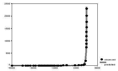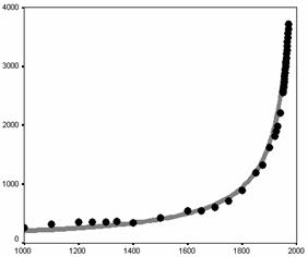 Диаграмма 0.3. Корреляция между эмпирическими оценками долгосрочной динамики численности населения мира (в миллионах чел., 1000 – 1970 гг.) и кривой, генерируемой уравнением фон Ферстера