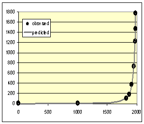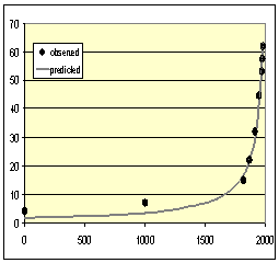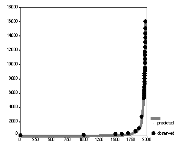 ПРИМЕЧАНИЯ: R = 0,998, R2 = 0,996, <![if !vml]> Параметры С (912057,9) и t0 (2008) определены методом наименьших квадратов. Для сравнения: лучшее соответствие (R2), получаемое для экспоненциальной модели, составляет 0,637. |