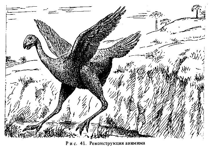 Итак, строение скелета археоптерикса свидетельствует о его наземном образе жизни, а перья и крылья — о способности к полету. Отсюда вслед за Остромом можно сделать вполне естественный вывод о первичном появлении летающих форм именно среди наземных животных. Пока оставим в стороне обсуждение непосредственных путей формирования крыла и полета (здесь с Остромом трудно согласиться), ибо это частная деталь общей проблемы происхождения птиц, для которой данные по археоптериксу не могут считаться решающими в силу их некоторой противоречивости. Обратим внимание на нее в целом и посмотрим, что может дать для ее решения авимим.