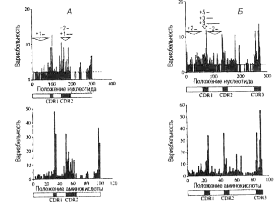 Во-вторых, геном мыши и человека содержит много V-генов зародышевой линии (примерно по 100 для Н- и L-цепей). И хотя их последовательности в каждой из групп (Н или L) высоко гомологичны, но есть и довольно заметные различия. Изменчивость V-элементов зародышевой линии и для Н-, и для L-цепей характеризуется кривой Ву—Кэбота, т. е. высоко неслучайна (рис. 5.3). В предыдущей главе мы уже рассказали, что такая картина неслучайной изменчивости создается только прямым антигенсвязывающим отбором, действующим на молекулу антитела, расположенную на поверхности В-лимфоцита. Этот вопрос обсуждался в предыдущей главе.