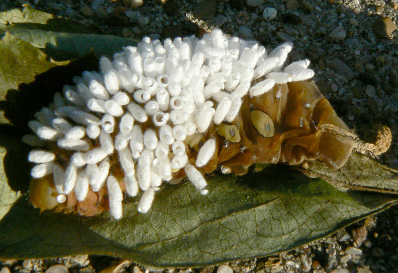 Личинки наездника съели заживо изнутри свою жертву - гусеницу, вылезли наружу и окуклились