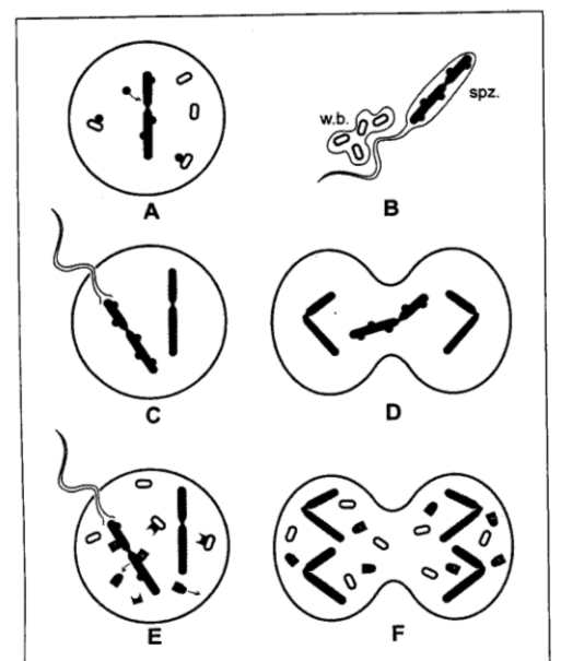 1. Цитоплазматическая несовместимость (ЦН) — наиболее широко распространенный эффект вольбахии, проявляющийся в том, что при скрещивании зараженных самцов с незараженными самками эмбрионы гибнут на ранних стадиях развития. Происходит это потому, что отцовские хромосомы в оплодотворенном яйце ведут себя ненормально и в конце концов разрушаются (Richardson et al., 1987; Callaini et al., 1997). В некоторых случаях это может быть связано с задержкой разрушения оболочки мужского пронуклеуса (Tram, Sullivan, 2002). В результате яйцо остается фактически гаплоидным. Молекулярный механизм ЦН до конца не выяснен. Согласно наиболее аргументированной из имеющихся гипотез, вольбахии, живущие в гонадах самца, каким-то образом модифицируют («метят») хромосомы сперматозоидов (рис.1). Эта метка и является причиной разрушения хромосом после оплодотворения. Однако если самка заражена тем же самым штаммом вольбахии, отцовские хромосомы не разрушаются, и из яйца развивается нормальная особь (естественно, зараженная). По всей вероятности, присутствующие в яйцеклетке бактерии каким-то образом распознают метку и спасают хромосомы от разрушения. Это распознавание и «спасение» (rescue) в большинстве случаев является штаммоспецифичным: вольбахии «спасают» только хромосомы, помеченные тем же самым штаммом (Werren, 1997).