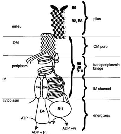 Аппарат T4SS образован несколькими virB-белками (рис. 2). Как видно из рисунка, белки virB2, virB3 и virB5 образуют пилус, virB6-10 — канал, virB4 и virB11 представляют собой внутренние мембранные АТФ-азы. Компоненты T4SS специфически взаимодействуют между собой; их точная «подогнанность» друг к другу подтверждается, в частности, отсутствием горизонтального обмена компонентами T4SS между разными эволюционными линиями бактерий (Cao, Saier, 2001).