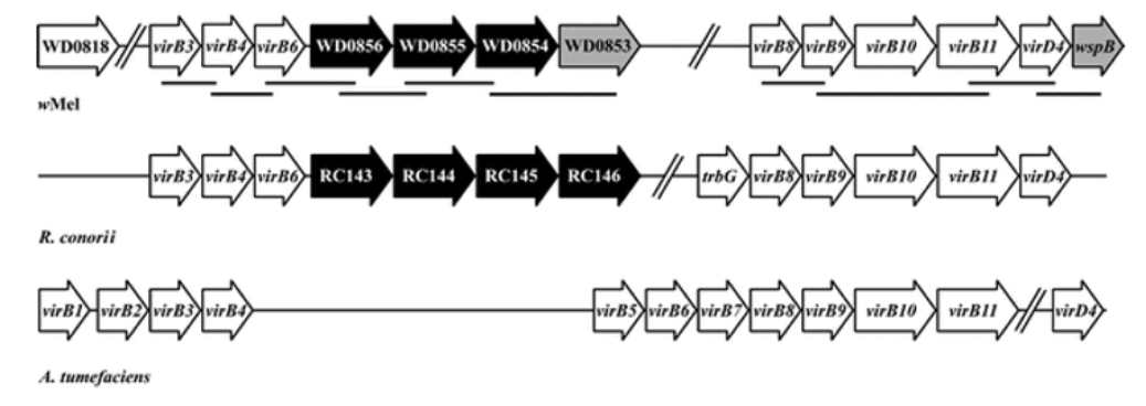 В геноме вольбахии гены vir собраны в два оперона. На рис. 3 показано строение vir-оперонов у вольбахии wMel, риккетсии (R.conorii) и агробактериума (A.tumefaciens). Видно сходство в строении оперонов T4SS у этих трех бактерий. Можно заметить, что у риккетсии и вольбахии — внутриклеточных бактерий — отсутствуют белки virB2 и virB5, образующие пилус. Очевидно, это связано с тем, что внутриклеточным паразитам не нужно вступать в контакт с наружной поверхностью клетки хозяина. Белок virD4, имеющийся у всех трех видов, не имеет фиксированного положения в T4SS: он прикрепляется к транспортируемым макромолекулам и помогает их транспортировке. Гомологи белка virD4 (TrwB, TraJ и др.) играют важную роль в конъюгации бактерий. Они обладают способностью связываться как с компонентами T4SS (в частности, с virB10), так и с релаксазами — белками, которые ковалентно связываются с ДНК донора в его цитоплазме и, по-видимому, первыми вводятся в цитоплазму реципиента, увлекая за собой донорскую ДНК. Показано, что связывание гомологов virD4 с релаксазами высоко специфично (связываются только «свои» релаксазы), а с virB10 — нет (один и тот же virD4 связывается с разными virB10, происходящими от разных штаммов или плазмид) (Llosa et al., 2002, 2003). У вольбахии релаксазы не обнаружены.