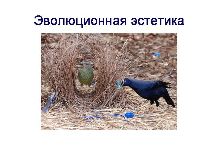 Если бы мы сумели взять у самца атласного шалашника интервью для журнала «Артфорум», он мог бы сказать примерно следующее: «Я нахожу совершенно необъяснимым это непреодолимое влечение к самовыражению, к игре с цветом и формой только ради них самих. Я не помню, когда впервые ощутил в себе неудержимое желание создавать насыщенные цветовые поля в рамках монументального, но при этом минималистского антуража, но когда я отдаюсь этой страсти, я ясно ощущаю свою связь с чем-то, находящимся вне меня. Когда я вижу красивую орхидею высоко на дереве, я чувствую, что просто обязан ее заполучить. Когда я вижу, что какая-нибудь ракушка в моем творении сдвинута с места, я должен положить ее обратно. Райские птицы могут отращивать красивые перья, но для этого не нужно обладать эстетическим чувством — только грубым инстинктом тела. То, что самки иногда приближаются ко входу в мою галерею и восхищаются моей работой, — лишь счастливая случайность, и было бы оскорбительно думать, что я творю, чтобы размножаться. Мы живем в постфрейдистскую, постмодернистскую эру, когда грубые сексуальные метанарративы уже неуместны для объяснения наших творческих импульсов».