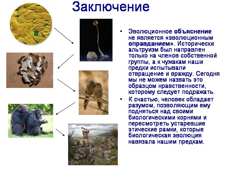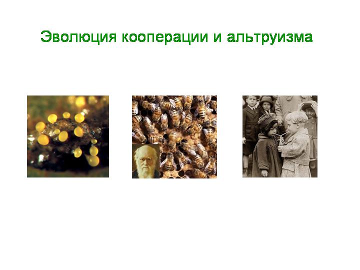 Появление многоклеточных, в том числе животных, стало крупнейшим триумфом эволюции альтруизма. В многоклеточном организме большинство клеток – это клетки-альтруисты, которые отказались от собственного размножения ради общего блага.