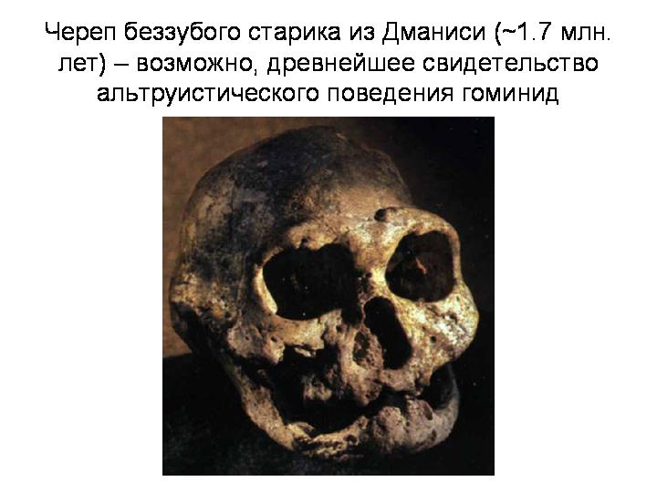 Уже около 2 млн лет назад ранние Homo, по-видимому, заботились о беззубых стариках. А ведь это альтруизм – кормить беспомощного старика.