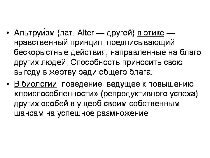 На этом слайде даны определения. Главное – помнить, что это, конечно, метафорический язык. Нам в силу особенностей нашего мышления удобно приписывать живым организмам цели и интересы. На самом деле, конечно, никаких осознанных интересов у большинства живых существ нет, тем более их нет у генов. Но благодаря действию естественного отбора живые объекты устроены и ведут себя так, как будто бы у них есть корыстный интерес, который состоит в том, чтобы как можно эффективнее размножиться, растиражировать свои гены в следующих поколениях. И когда какой-то организм вдруг начинает вести себя вопреки этому корыстному интересу, причем его поведение идет на пользу интересам других организмов, в этом случае мы и говорим об альтруистическом поведении. Это просто удобный метафорический язык, без которого было бы крайне трудно доходчиво изложить многие важные биологические идеи и теории.