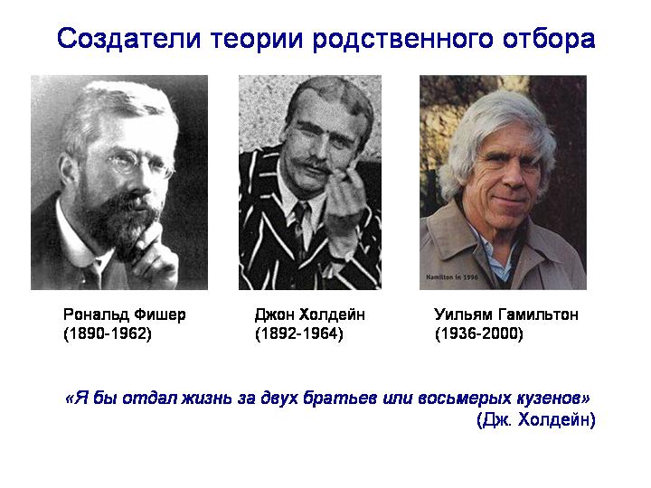 К этой мысли биологи стали подходить уже в 30-е годы прошлого века. Важный вклад в понимание эволюции альтруизма внесли Рональд Фишер, Джон Холдейн и Уильям Гамильтон.