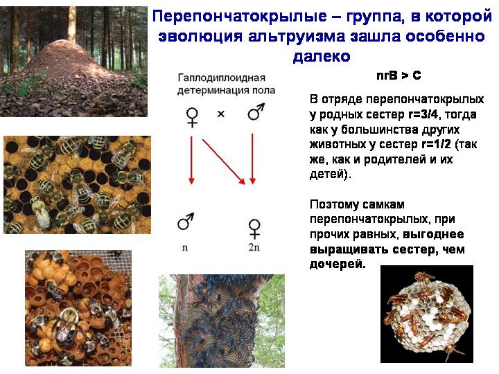 Эволюция альтруизма особенно далеко зашла у перепончатокрылых насекомых: муравьев, пчел, ос, шмелей. У общественных перепончатокрылых большинство самок отказываются от собственного размножения, чтобы выкармливать сестер. Это высшее проявление альтруизма. Таких животных называют «эусоциальными», то есть «истинно общественными». Но почему именно перепончатокрылые?