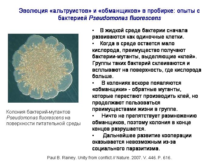 Кроме родственного отбора, существуют и другие механизмы, которые помогают, или, наоборот, препятствуют эволюции альтруизма. Рассмотрим эти механизмы на конкретных примерах. Начнем с самых простых организмов – с бактерий. У них тоже кооперация и альтруизм встречаются сплошь и рядом.